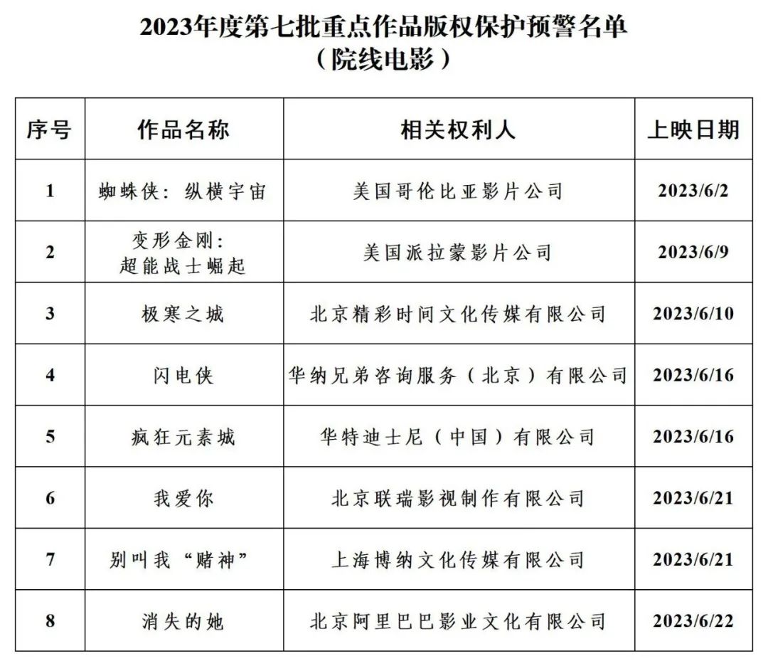 按照国家版权局《关于开展院线电影版权保护专项工作的通知》《关于进一步加强互联网传播作品版权监管工作的意见》及版权重点监管工作计划,根据相关权利人上报的作品授权情况,现公布2023年度第七批重点作品版权保护预警名单。