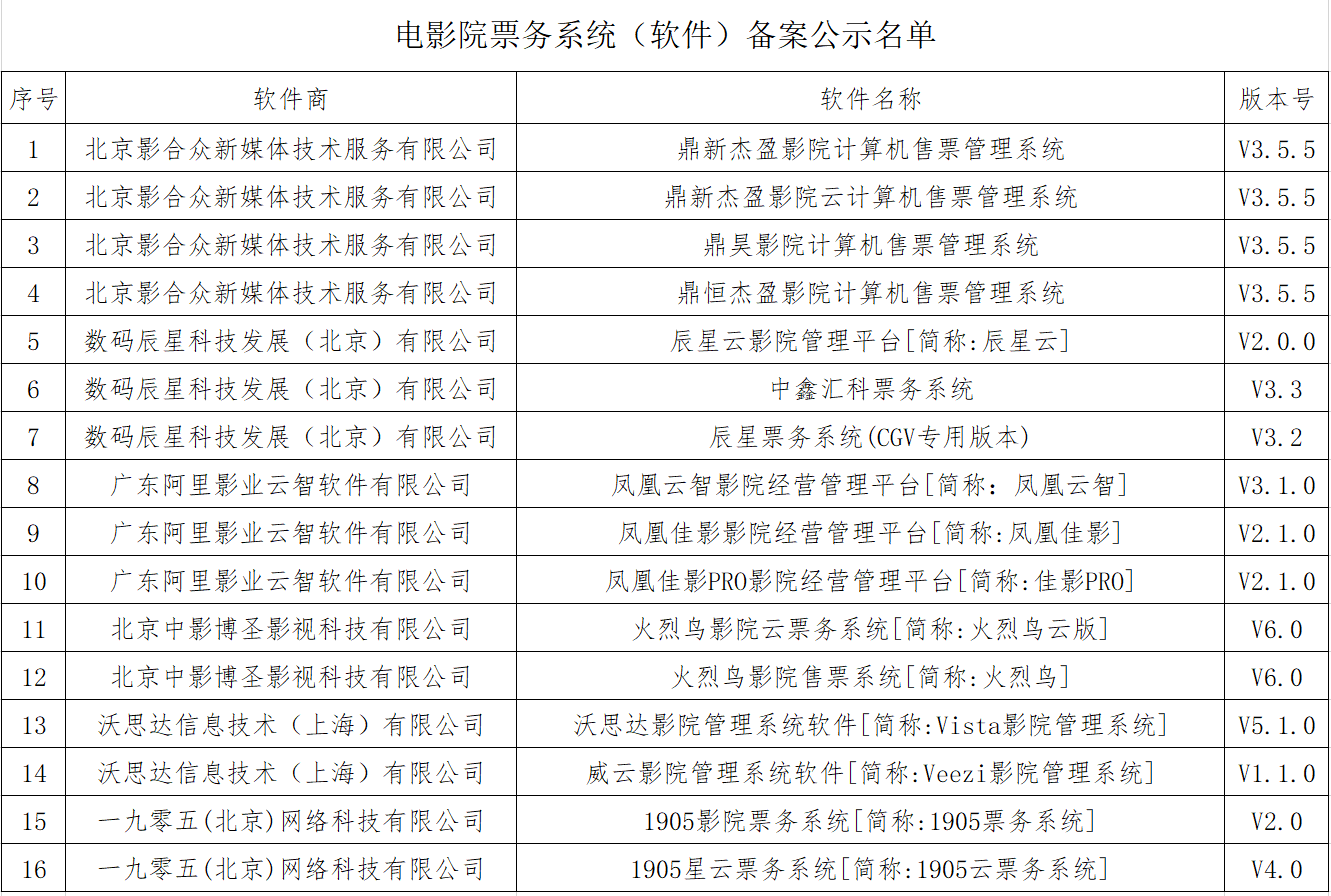电影院票务系统(软件)备案公示名单